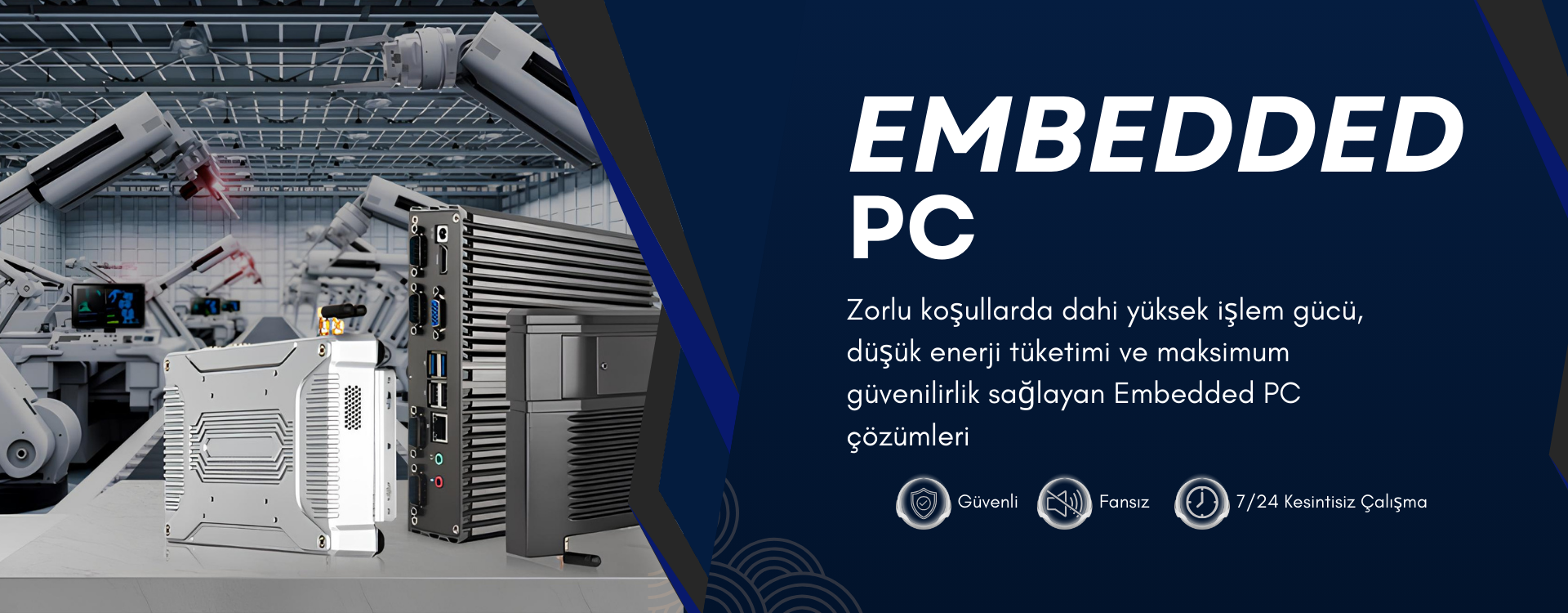 DIN-rail, VESA, duvar montajı; geniş I/O, fanless tasarım ve 7/24 çalışma.